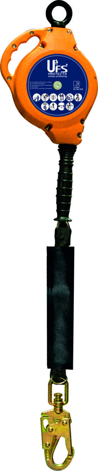 USP-16000(06)E High impact Strength polymer Galvanized Steel Wire Rope of dia 5 mm. 15kN It Comes with various option of UFS hooks to choose from as per the requirements. Anchorage Eye with swivel action EN 360:2002  &  As per ANSI Z359.14-2021 4.3kg